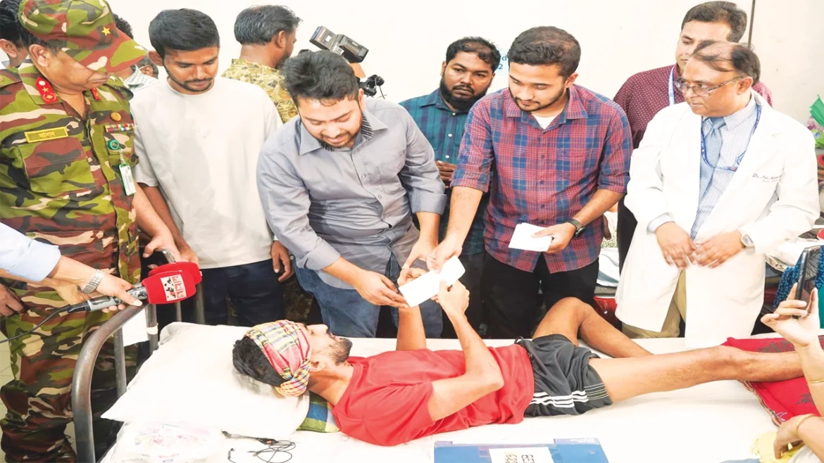ছাত্র-জনতা আন্দোলনে আহত রোগীদের আর্থিক সহায়তা দিলেন উপদেষ্টা নাহিদ ইসলাম ও আসিফ মাহমুদ সজিব ভুইয়া। ঢাকা মেডিকেল হাসপাতাল ও পুরাতন বার্ণ ইউনিটে ভর্তি থাকা মোট ৩০ জন রোগীকে ৩০ লাখ টাকার অনুদান দিয়েছে। প্রতি রোগিকে চেকের মাধ্যমে এক লক্ষ টাকা করে দেওয়া হয়েছে। জুলাই শহীদ স্মৃতি ফাউন্ডেশন এর পক্ষ থেকে তাদের আর্থিক সহযোগিতা করা হয়। এই পর্যন্ত ১ কোটি ৭১ লক্ষ ৪২ হাজার প্লাস টাকা সহযোগিতা করা হয়েছে বলে জানান উপদেষ্টারা।