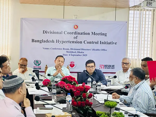 বৃহস্পতিবার ঢাকার বিভাগীয় পরিচালকের (স্বাস্থ্য) কার্যালয়ে অনুষ্ঠিত বিভাগীয় সমন্বয় সভায় এসব তথ্য জানানো হয়। সভায় স্বাস্থ্য অধিদপ্তরের অসংক্রামক রোগ নিয়ন্ত্রণ কর্মসূচি (এনসিডিসি), ন্যাশনাল হার্ট ফাউন্ডেশন অফ বাংলাদেশ ও Resolve to Save Lives-এর সহায়তায় পরিচালিত কার্যক্রম- বাংলাদেশ হাইপারটেনশন কন্ট্রোল ইনিশিয়েটিভ এর অগ্রগতি ও ভবিষ্যৎ পরিকল্পনা নিয়ে আলোচনা হয়।