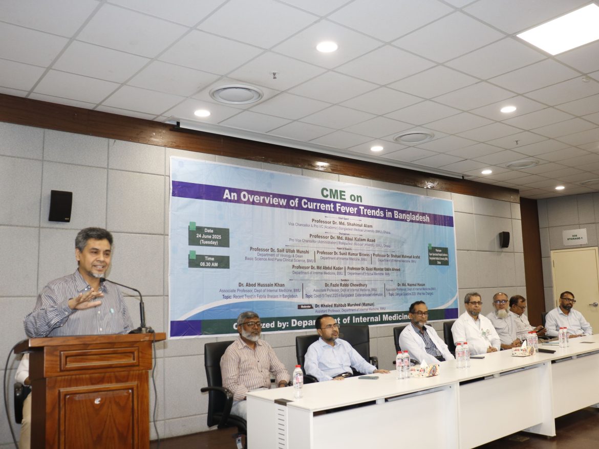মঙ্গলবার বাংলাদেশ মেডিকেল বিশ্ববিদ্যালয় (বিএমইউ) অনুষ্ঠিত একটি ‘কনটিনিউইং মেডিকেল এডুকেশন’ (সিএমই) সেশনে করোনা, ডেঙ্গু জ্বরের সাম্প্রতিক প্রবণতা ‘এন ওভারভিউ অফ কারেন্ট ফিভার ট্রেন্ডস ইন বাংলাদেশ’ শীর্ষক এক বিশদ আলোচনা ও পরিসংখ্যান উপস্থাপন করা হয়। এসময় বিশ্ববিদ্যালয়ের মেডিসিন বিভাগের সহযোগী অধ্যাপক ডা. আবেদ হোসেন খান তার উপস্থাপনায় ‘রিসেন্ট ট্রেন্ড ইন ফেব্রাইল ইলনেসেস ইন বাংলাদেশ’ বিষয়ে এসব তথ্য তুলে ধরেন।