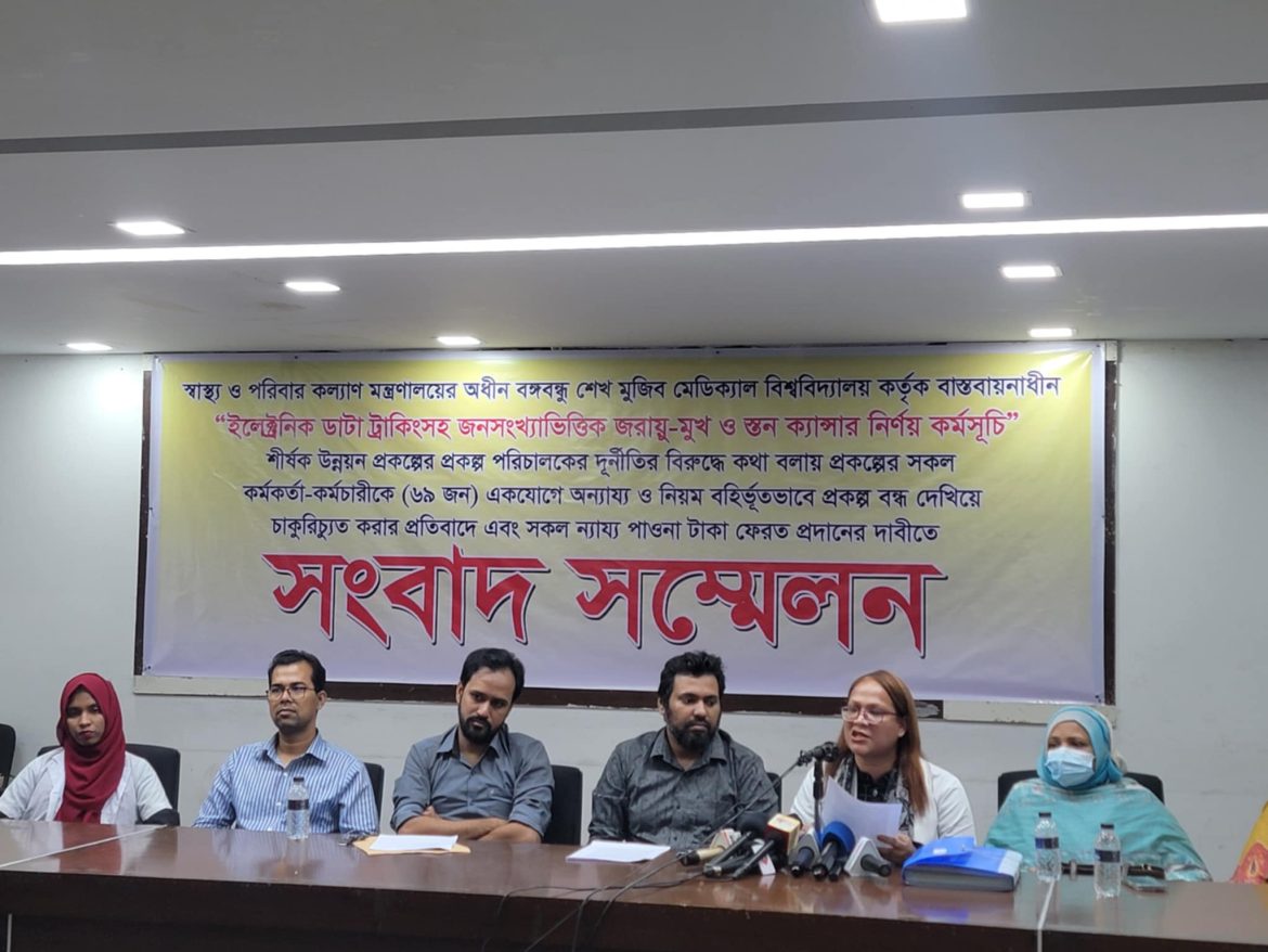 তিনি আরও বলেন,‘আমরা প্রাপ্য টাকা চেয়ে ৭ অক্টোবর প্রকল্প পরিচালকের কাছে চিঠি দিয়ে প্রাপ্য সকল টাকা বুঝিয়ে দিতে বলা হলে প্রকল্প পরিচালক আত্মসাৎকৃত টাকা প্রদান করতে অস্বীকার করে। তিনি জানান প্রকল্প পরিচালনায় নানাবিধ হিসাব বহির্ভূত ব্যয় যেমন— মন্ত্রণালয়ের বিভিন্ন ডেস্ক ‘ম্যানেজ করা’, অডিট সামলানো, গাড়ি ভাড়া ইত্যাদি কার্যক্রম পরিচালনার জন্য এই টাকাটা উনি উত্তোলন করেন। আমরা তাকে বলি, উনি তো প্রকল্পের জনবলের প্রাপ্য টাকা কেটে প্রকল্পের কার্যক্রম পরিচালনা করতে পারেন না। প্রকল্প পরিচালক বিভিন্ন উচ্চপদস্থ ব্যক্তি দিয়ে হুমকি দেওয়া শুরু করেন এবং গাইনোকোলজিক্যাল অনকোলজি বিভাগের চেয়ারম্যান অধ্যাপক শিরিন আক্তার বেগম আমাদের দেখে নেওয়ার হুমকি দেন ও আমাদের চাকুরিচ্যুত করবেন বলেন।’