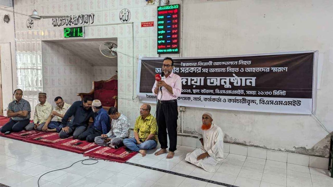 শনিবার (১৭ আগস্ট) সকালে বিএসএমএমইউর কেন্দ্রীয় মসজিদে বৈষম্যবিরোধী ছাত্র আন্দোলনকে কেন্দ্র করে পুলিশের গুলিতে নিহত ডা. সজীব সরকারসহ নিহত ও আহতদের স্মরণে দোয়া মাহফিলে এই দাবি করেন। এই অনুষ্ঠানের আয়োজন করেন বিশ্ববিদ্যালয়ের চিকিৎসক ও কর্মকর্তা-কর্মচারীর। দোয়া মাহফিলে ডা. সজীবের বাবা এবং বৈষম্যবিরোধী ছাত্র আন্দোলনের দুইজন সমন্বয়কও উপস্থিত ছিলেন।